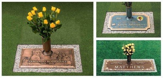 At Norview Gardens, we use bronze memorials (instead of tombstones), which are placed level with the ground to blend with the beauty of the landscape. We offer the highest quality bronze memorials at fair prices to give you the best value. Each bronze memorial is secured to a solid granite base. A cast bronze marker paired with a polished granite base is a special way to permanently memorialize your loved one. Bronze is a metal alloy consisting of copper and tin. It is a perfect material for memorialization because its appearance evolves naturally over time. You may also choose to add a bronze flower vase to your marker for the placement of flower bouquets throughout the year.
